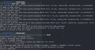 Les fichiers sont malheureusement tous protégés par mot de passe. Cependant si le mot de passe est considéré comme faible (faible nombre de caractères, sans majuscules/chiffres/caractères spéciaux) on peut utiliser des outils pour bruteforcer automatiquement et trouver le bon mot de passe. Pour cela il faut d'abord récupérer le hash du fichier protégé par mdp, puis le comparer aux ash des mots de passe bruteforcé.