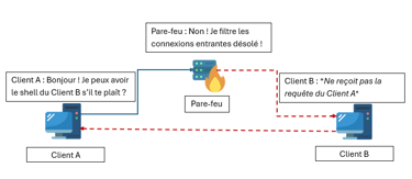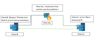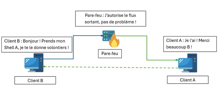 Nous avons vu ce qu'est un shell, sans entrer dans les détails il s'agit simplement d'un interpréteur de commande pour agir directement sur un système. Mais du coup c'est quoi un reverse shell? En informatique pour des raisons de communication, il est tout à fait possible d'avoir deux machines A et B, ou A utilise justement un shell et utilise une commande pour dire à B "tiens je te donne accès à mon shell". Cela sert dans certains contextes de dépannage/support, notamment lorsque dans un réseau les communications sont bloquées par firewall, on empêche plus généralement les connexions entrantes et moins souvent les sortantes. Par exemple un utilisateur souhaite avoir accès à la machine B. Il peut être bloqué par un firewall s'il filtre le flux SSH entrant. A l'inverse le firewall ne filtre pas les connexions sortantes, il donne donc la possibilité de communiquer grâce à un reverse shell: